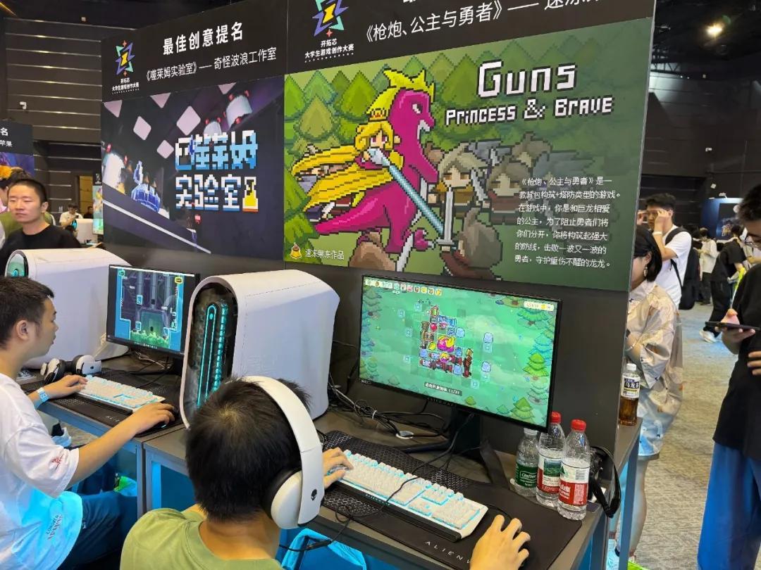 比如讓我印象深刻的《槍炮、公主與勇者》,通過開發團隊在作品展示&答辯時的介紹,我瞭解到他們分別來自清華、北大和上海交大。在我看來,這個堪稱大學生裏的全明星陣容,做出來的產品也足夠有創意:在這款遊戲的設定中,公主愛上了巨龍,因此她想要保護沉睡的巨龍,擊敗前來挑戰的勇者。
