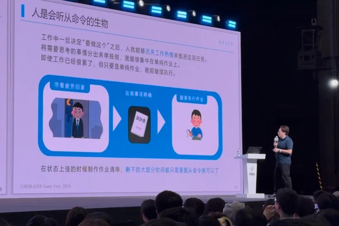 另外他還指出,遊戲開發應該被分成「要思考的內容」和「單純作業內容」,趁自己狀態好的時候,把要思考的內容全部想好,平日裏只做那些單純的生產工作,這樣一來,就能避免在長線作戰中產生疲勞感。