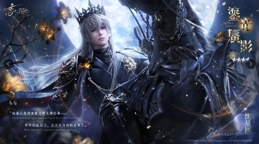 這回,《戀與深空》依然嘗試了先前自己沒做過的題材:長髮沈星迴,配上暗色系的鎧甲與皇冠,以及巨劍、他釋放技能時周邊綻放的流明花……共同傳遞出一種「暗黑+奇幻」的特殊風格。這次日冕套裝卡解鎖的全新搭檔身份名爲「暗蝕國王」,也與主題風格相當搭配。