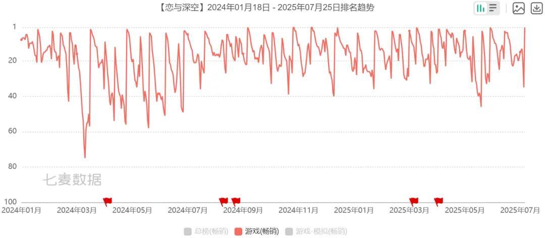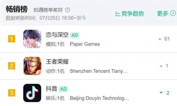 今天(7月25日),在更新推出沈星迴單人日冕套裝卡池「沉墜的冠冕」後,《戀與深空》登上了國區iOS暢銷總榜。