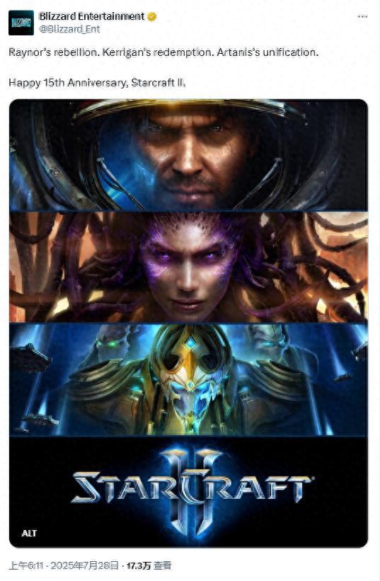 今日,暴雪旗下RTS遊戲《星際爭霸2》迎來發售15週年紀念日,暴雪官推發佈了慶祝動態。本作於2010年7月28日正式登陸PC平臺。《星際爭霸2》延續了初代作品《星際爭霸》的經典世界觀設定,並保留了一些兵種和建築。