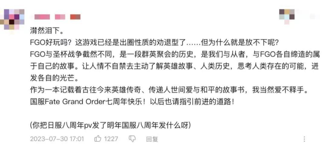在評論區,因爲PV有感而發,回顧自己FGO遊玩歷程的玩家更是數不勝數。但也會有玩家開玩笑,「你把日服八週年PV發了,明年國服發什麼呀」——這一定程度上折射出國內FGO玩家的窘境。