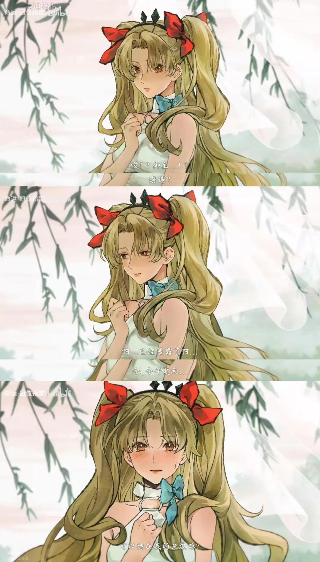 在PV後半段,西湖附近的涼亭裏,艾蕾先是略顯羞怯地看向別處,「哎?!御主…!謝謝?啊……已經暴露了啊…」又鼓起勇氣面向鏡頭,皺着眉頭,滿臉通紅地跟玩家發出請求,「今年夏天,可以待在我的身邊嘛?」簡單兩句話將少女的純真可愛發揮得淋漓盡致。