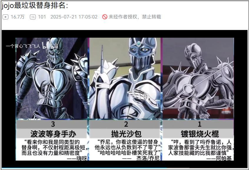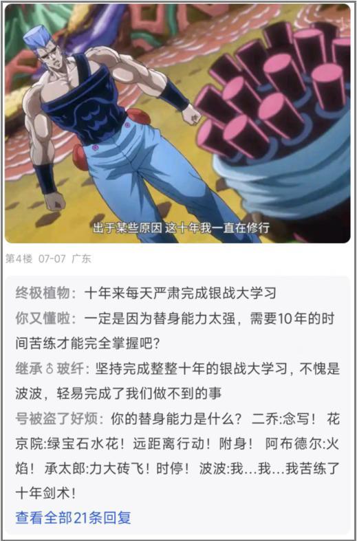 JOJO動畫第三部《星塵鬥士》播出十餘年後,主角團之一的波魯納雷夫卻在ACG論壇越來越火了。每天都有人研究“銀戰大學習”,甚至在一些和JOJO無關的貼吧,你都能找到各種迫害波魯納雷夫的帖子,讓人聯想到擁有無數變體的一眼丁真和詹姆斯梗。