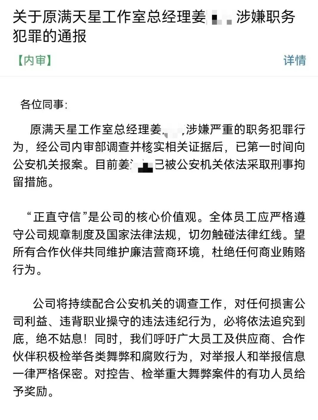 中手遊反腐通報:原滿天星工作室總經理因涉嫌職務犯罪被刑拘