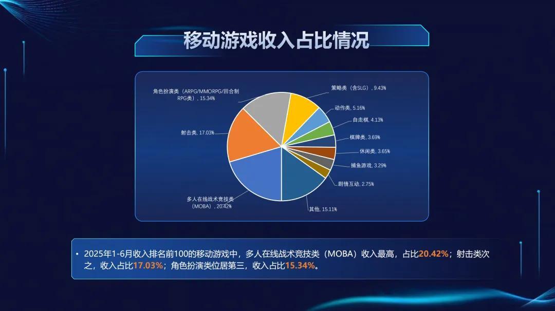 其中,多人在線戰術競技類(MOBA)收入最高,佔比20.42%;射擊類次之,收入佔比17.03%;角色扮演類位居第三,收入佔比15.34%。