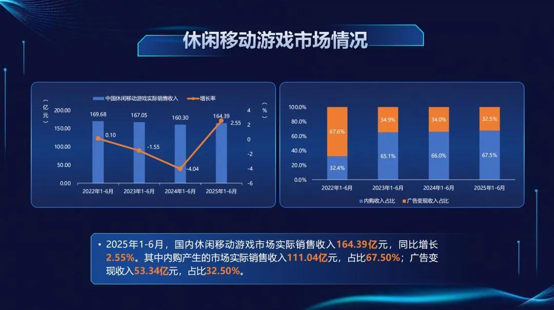 國內休閒移動遊戲市場實際銷售收入164.39億元,同比增長2.55%。其中內購產生的市場實際銷售收入111.04億元,佔比67.50%;廣告變現收入53.34億元,佔比32.50%。