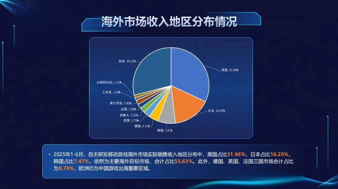 出海市場方面,美、日仍是我國手游出海的主要目標市場,佔比分別爲31.96%和16.20%;韓國位於第三,爲7.47%。此外,德國、英國、法國三國市場合計佔比爲8.78%,歐洲仍爲中國遊戲出海重要區域。