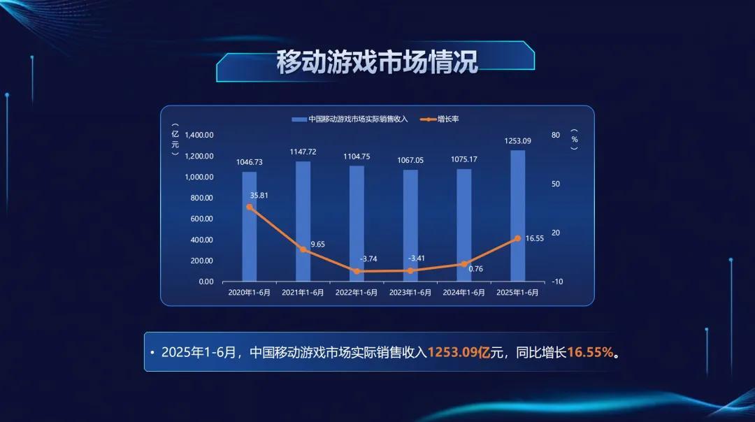按設備來看,2025年1-6月,中國移動遊戲市場實際銷售收入1253.09億元,同比增長16.55%。