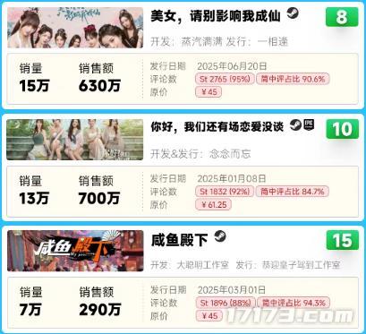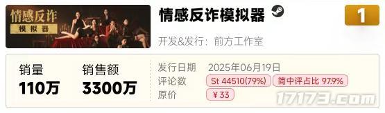 本月,國遊銷量榜公佈了2025年國產遊戲銷量半年榜的TOP15,其中的榜首自然是之前紅極一時的《情感反詐模擬器》,而且統計數據是截止至6月30日,遊戲發售日期則是6月19日,也就是短短11天,就賣出去了110萬份。
