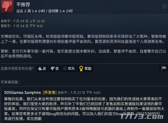 505也在Steam評論區對差評做出高強度回應,看得出來大家都在盡力彌補這些問題。