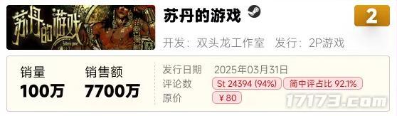 除此之外,剛剛宣佈過銷量達到100萬的《蘇丹的遊戲》也是斷層領先,位列第二名。與第三名《無限機兵》相差60萬的銷量,國產獨遊的差距還是相當大的。