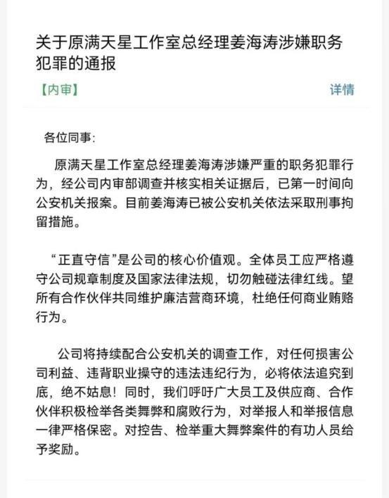 2025年7月30日,網傳中手遊發佈內部通報稱,旗下滿天星工作室原總經理、《仙劍世界》製作人姜海濤因涉嫌嚴重職務犯罪,已被公安機關刑事拘留。