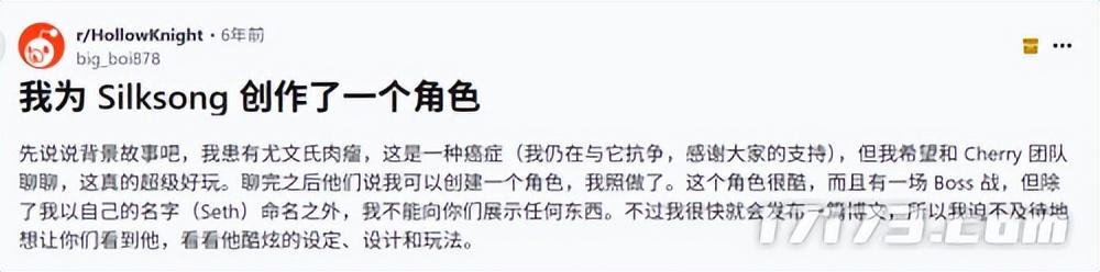 這位BOSS的招式十分樸素,但BGM中卻帶着一股悲壯的味道,仔細研究後發現,該BOSS實際是絲之歌製作組爲了紀念一位五年前病逝的空洞騎士玩家而製作的角色。