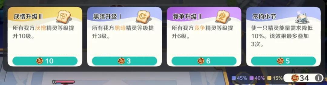 該模式局內運營的對象也不是精靈和英雄,而是各種各樣的BUFF。玩家通過錢來刷取心儀的BUFF,每堅持一定輪次就會升高稀有BUFF的刷新概率。