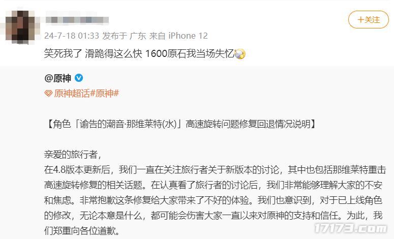 又或者說,當《原神》撤銷那維萊特重擊高速旋轉修復改動,又要免費送給玩家1600原石的時候,很多玩家也是當場一個大記憶清除術,瞬間忘記了日常問候策劃家裏人。