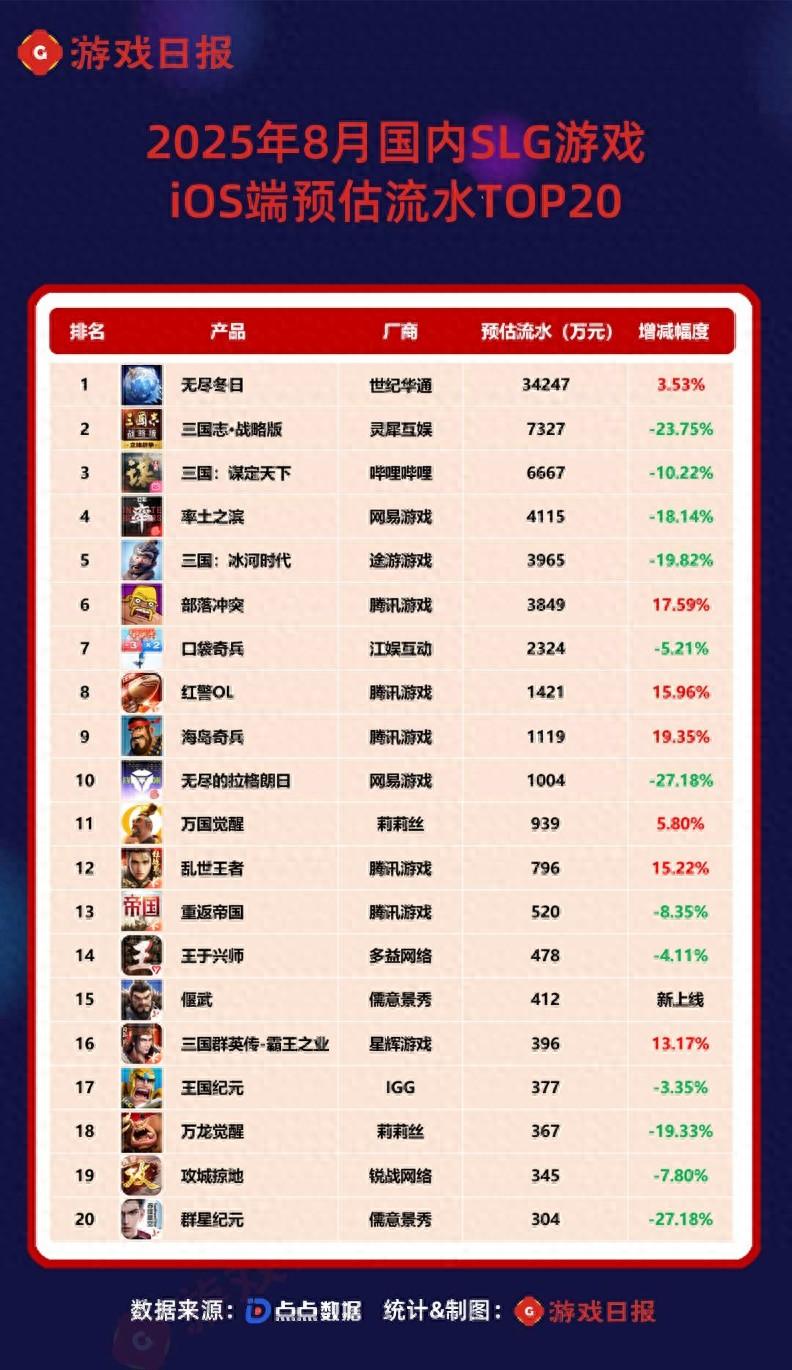 點點互動《無盡冬日》依舊穩定國內SLG龍頭位置,保持iOS端月預估流水3億元以上,在8月份還有小幅度上漲。