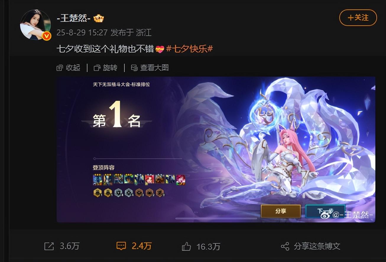 還有王楚然,今年七夕,王楚然在微博曬了張用至臻香水寶石不朽阿狸“喫雞”的剷剷戰績圖,讓不少人驚呼“原來女神也玩鏟啊”。
