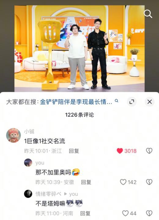 而且該說不說,李哥這粉絲“鏟”濃度也太高了,當時小葉和李現合影,突然有粉絲在底下評論了一句:"1社交名流1巨像"——當場給我笑麻了。這屆粉絲是懂強化果實效果的。