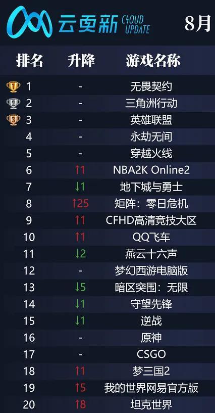 不久前,網吧業主常用的管理軟件「精靈AI」和「雲更新」相繼發佈8月榜單,作爲PC遊戲生態的重要載體之一,網吧的表現也能從側面反映出當前市場的熱度與未來趨勢。