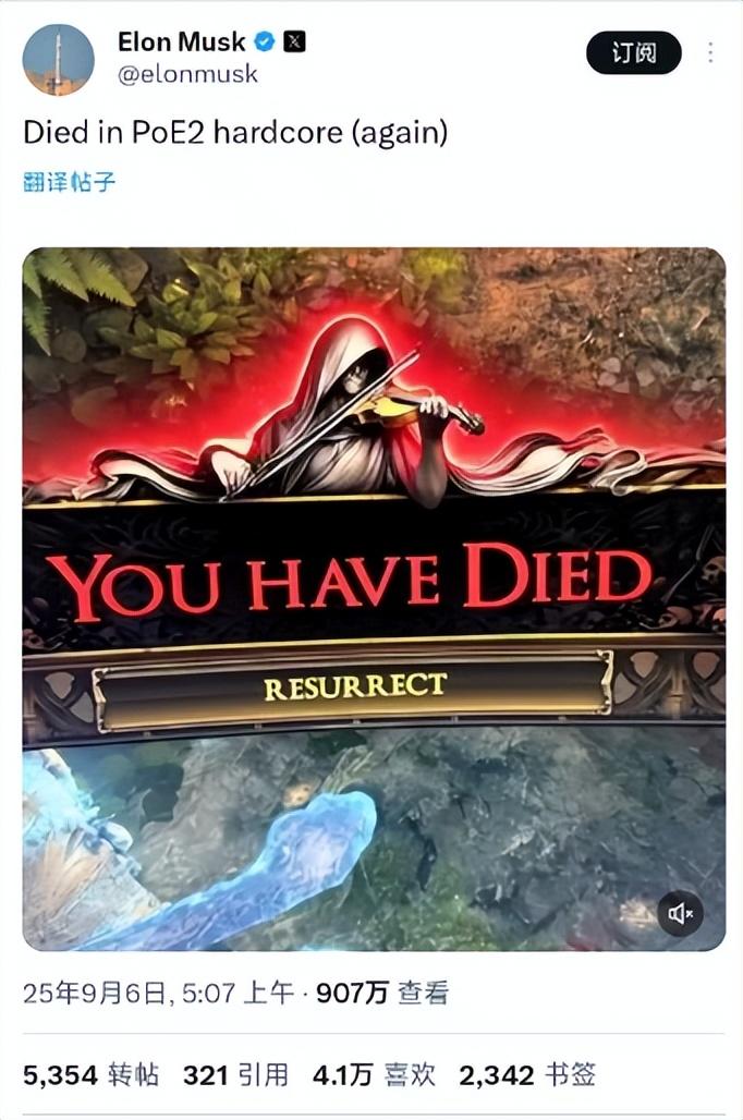這麼高的熱度,再次喚醒了馬斯克的開荒熱情,9月6日他發了條推特,展示了自己玩專家模式“去世”的截圖,用自黑挽回了些好感,也給POE2當了回自來水。