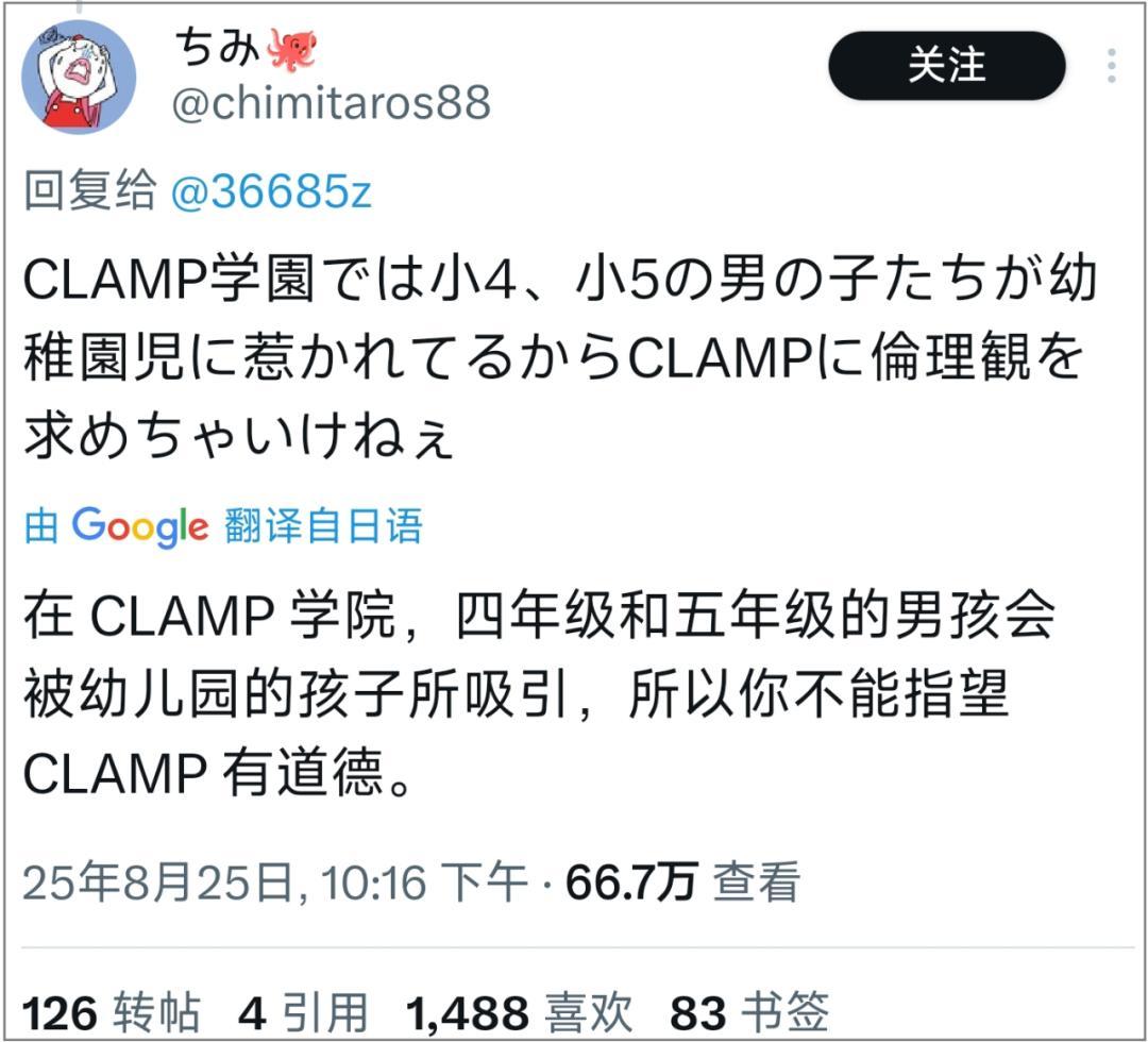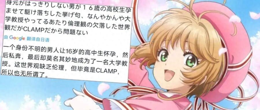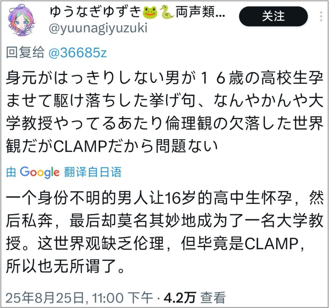 支持博主的觀點認爲,“一個身份不明的男人讓16歲高中生懷孕,然後私奔,卻莫名其妙成爲了一名大學教授。這樣的世界觀缺乏倫理,所以你不能指望CLAMP有道德。”