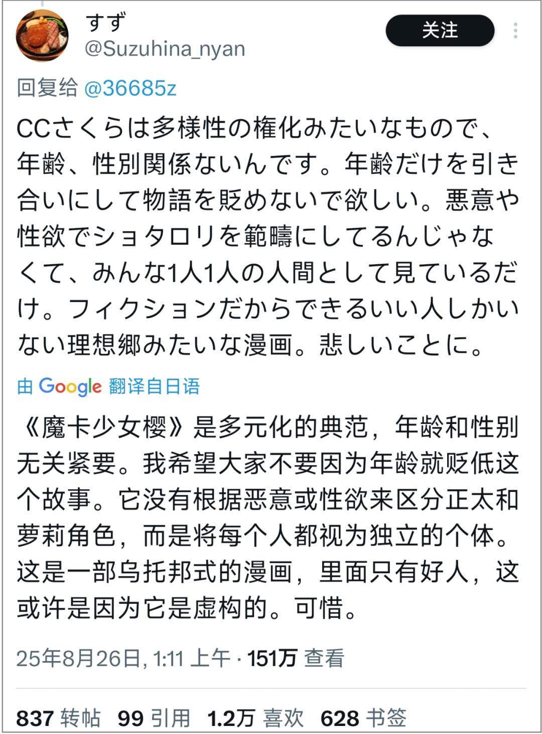 也有人反駁道,“《魔卡少女櫻》是多元化的典範,年齡和性別在這個故事中無關緊要。它沒有根據惡意和性慾來區分正太或者蘿莉,而是將每個人都視爲獨立的個體。這是一部只有好人的烏托邦漫畫,但之所以如此,或許就是因爲它是虛構的,可惜。”