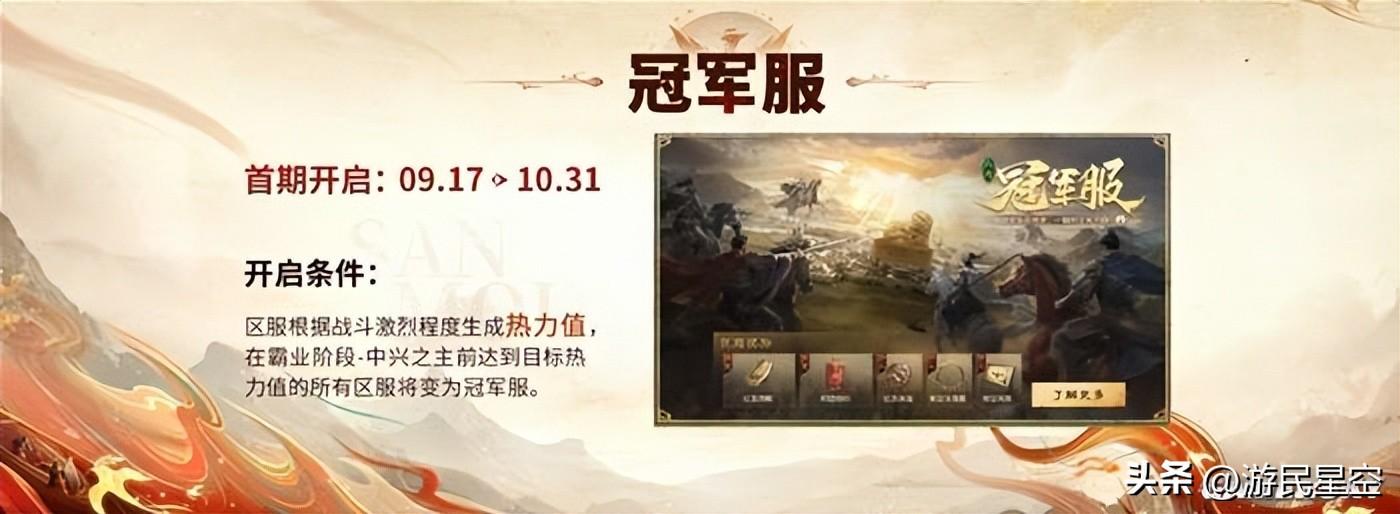 在9月17日-10月31日期間,系統將根據區服內玩家們作戰時的戰鬥規模、戰鬥烈度、殺敵數量、推進格數等綜合因素生成【熱力值】信息,最後在規定時間內達成熱力值目標的區服都將會成爲【冠軍服】,玩家也將在遊戲內外獲得各種豐富的獎勵。