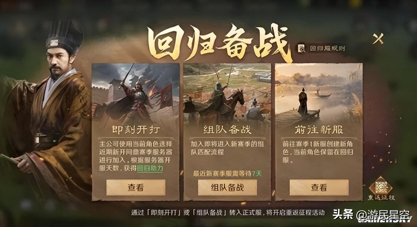 最後,爲了能讓回坑的老玩家們儘快恢復狀態,儘快跟上節奏,《三國:謀定天下》將於10月正式推出【迴歸服】。不同於傳統服務器,【迴歸服】更像是一個幫助玩家快速融入遊戲的臨時聚集地,系統將根據玩家的個人意願與退遊時間,制定不同的迴歸服務,以助力迴歸玩家儘快適應遊戲節奏,更快投身賽季新服更緊張、刺激的大戰場博弈中。