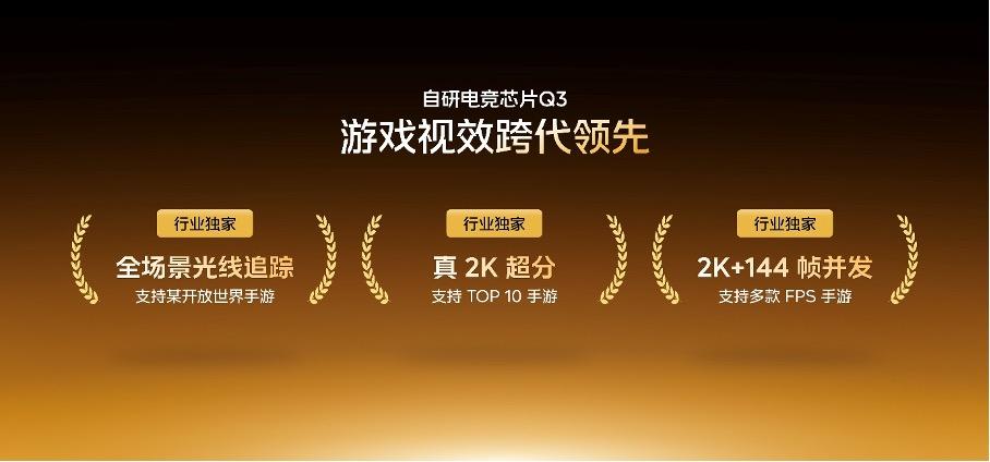 自研電競芯片 Q3 是 Q 芯片的集大成之作,是行業少有具備“全場景光線追蹤+遊戲超分+遊戲超幀”能力的獨立顯示芯片,採用全新硬件架構,通過 QNSS 超級渲染引擎、全場景自研光線追蹤技術和 AI 核,實現性能、能效、緩存、功耗製程等各項數據的全維度領先,是真正的“手機獨立顯卡”,引領遊戲視效體驗來到媲美主機視效的時代,首款搭載機型爲 iQOO 15。