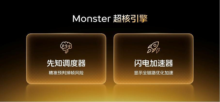 Monster 超核引擎包括“先知調度器”和“閃電加速器”,可以實現“同平臺,我更流暢”,是能夠滿足專業電競賽事要求的電競級遊戲引擎,響應速度快,性能爆發猛、幀率表現穩,讓酷客玩起遊戲“超快、超猛、超穩”。首批搭載機型爲iQOO 15和iQOO Neo11。