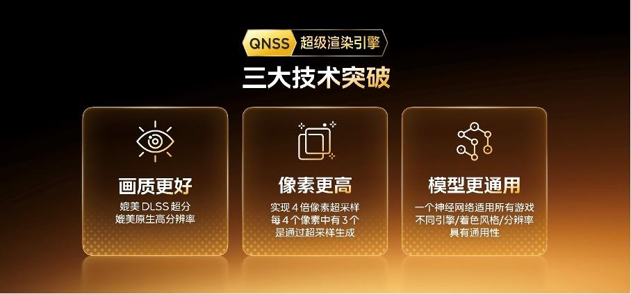 自研電競芯片 Q3 擁有領先的“自研 QNSS 超級渲染引擎”,實現“一半的性能開銷,翻倍的性能和畫質表現”。QNSS 架構超分技術內核原理與 DLSS 2.0 高度一致,可實現媲美原生高分辨率的畫質提升、4 倍像素超採樣以及用於所有遊戲的通用模型。還帶來 2K 超分截圖,讓真 2K 畫質不但看得見,還能留得住。