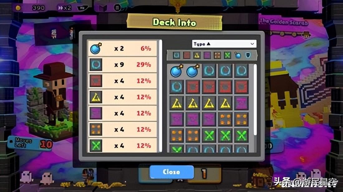 如果說滑動操作帶來了爽快感,那麼輕度肉鴿與卡組構築的融入,則賦予了遊戲更高的可玩性。在《奪寶磚家》中,你消除的“圖案”其實就是你的卡牌。你需要通過關卡中獲得的資源,不斷構築和強化自己的卡組。當卡組搭配得當時,就能頻繁觸發多種連鎖效果,真切地把“尋寶之旅”演繹得淋漓盡致。