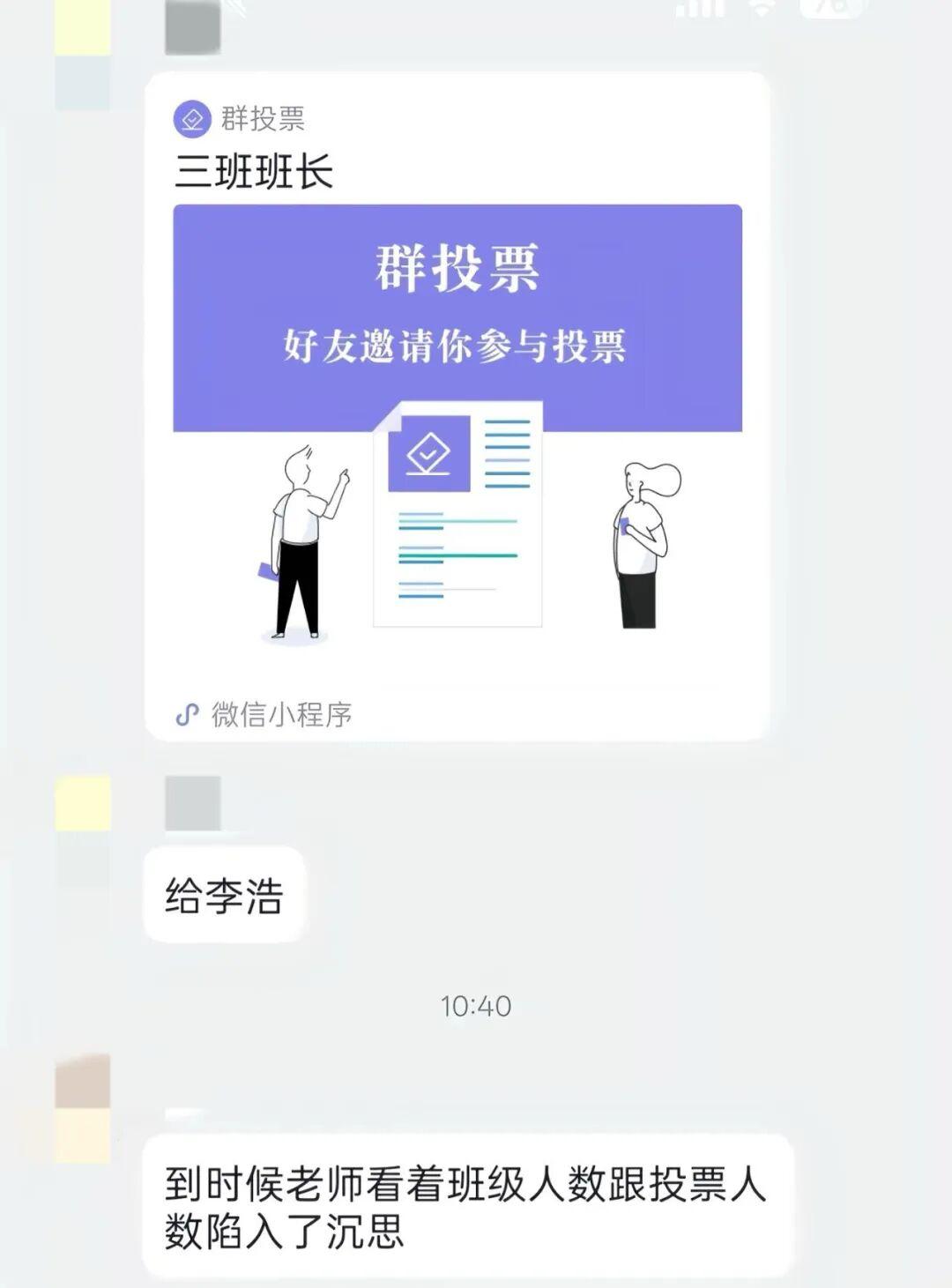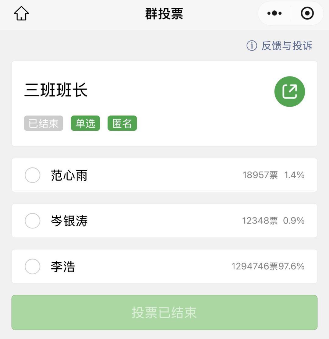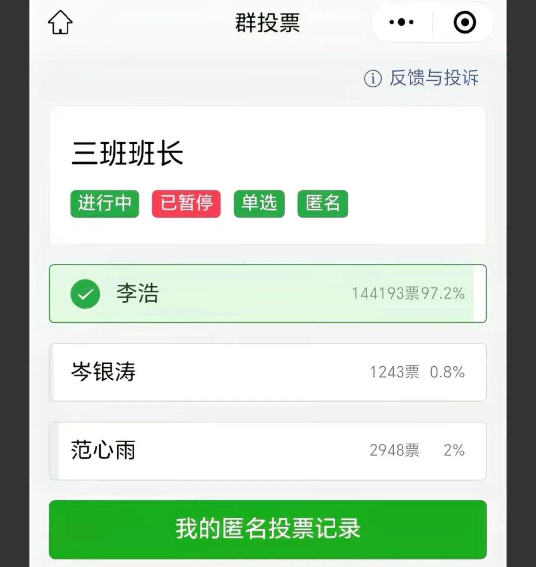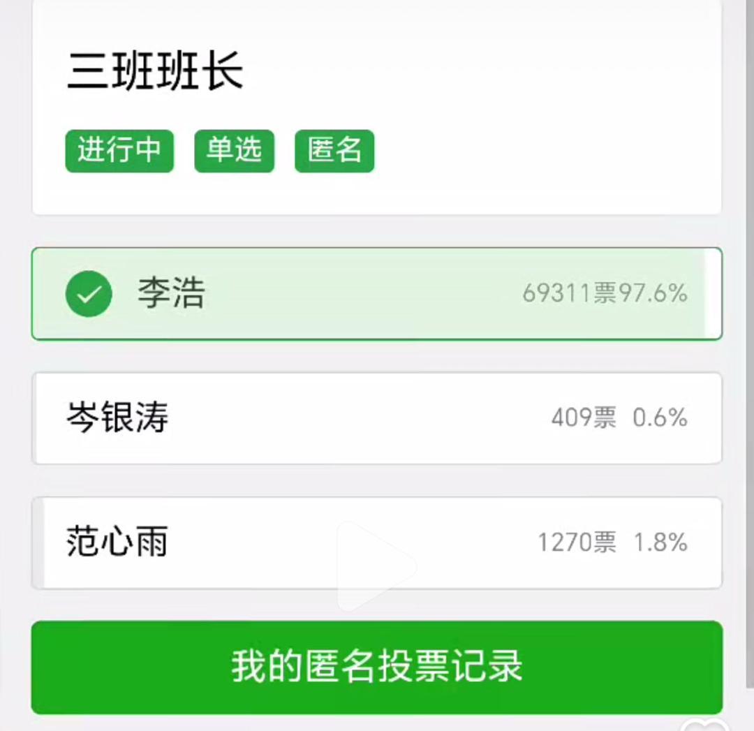 幾天前,某學校某年級三班正在競選班長。他們使用了最民主的方式,在小程序上發起了匿名投票,候選人只有三位同學。