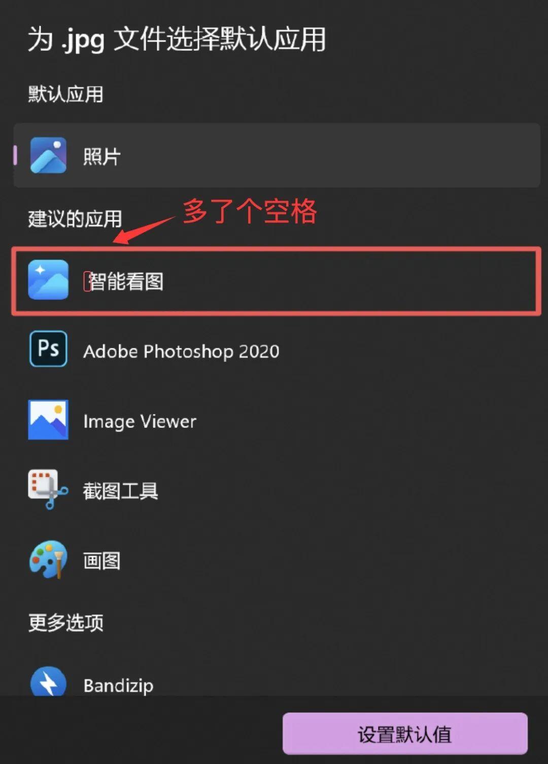 最騷的是,“ 智能看圖”的名字最前面還加了個空格。估計是想在打開方式的列表裏強制置頂,增加用戶誤觸的概率。總之非常細節,非常貼心。