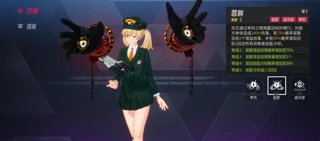 舉個例子,劇情中我們解救下來的高校“風紀委員”風見一宵隨時不忘“校紀”,她的戰鬥形態是帶着鎖鏈、會睜眼的黑手,技能設定也是“審判之眼”帶來各種效果。從劇情到形象再到技能,都有一定的關聯性,可以更形象生動地讓玩家快速記住該角色。