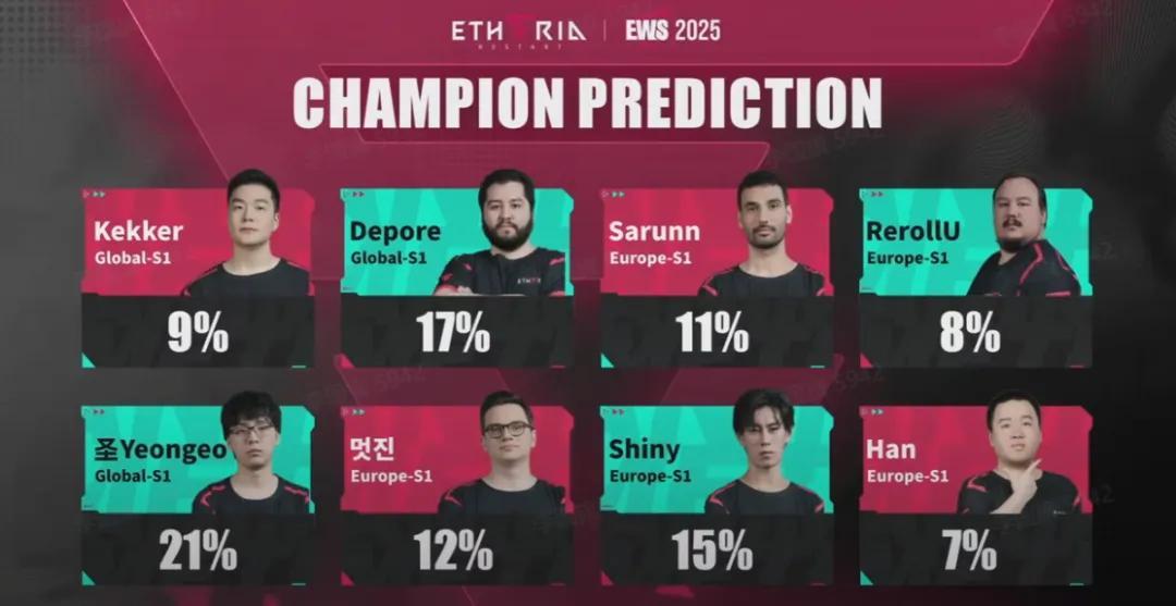 還有電競,此前海外上線時《伊瑟》就快速落地了大型賽事EWS,吸引了海外諸多魔靈Like的愛好者參加。作爲一款重策略的卡牌產品,電競能夠高品質呈現《伊瑟》策略對抗的樂趣與戰局多變的激情,比如EWS上奪冠熱門首戰就爆冷出局止步8強;拿下亞軍的Han靠機制連環反殺對手震驚全場;最終奪冠的Kekker預測支持率甚至是倒數……