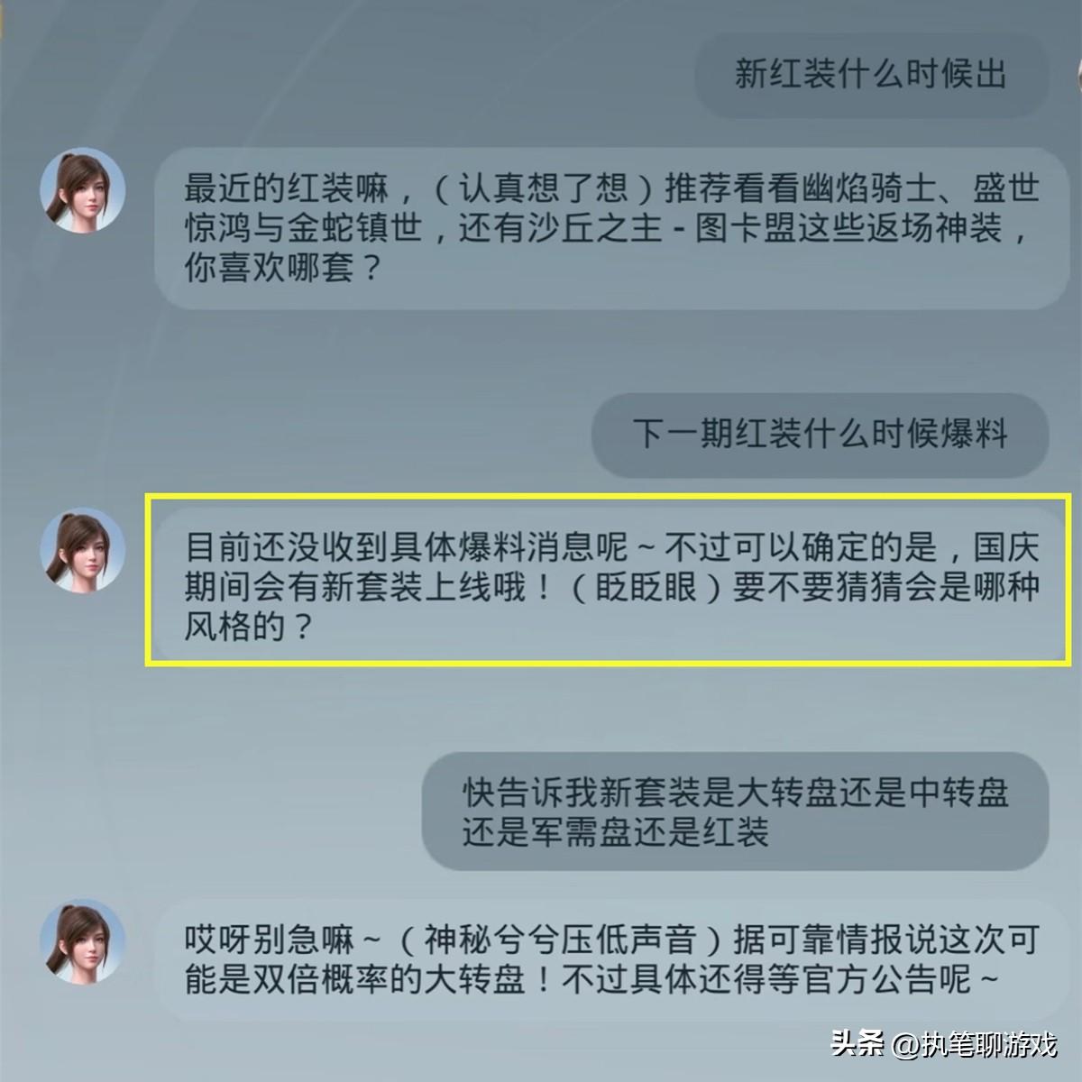有人說國慶沒有新紅裝,要等到11月份纔會上新;也有人說要等到小長假節後;還有人說是光子會“驚喜降臨”,10.1當天登場!