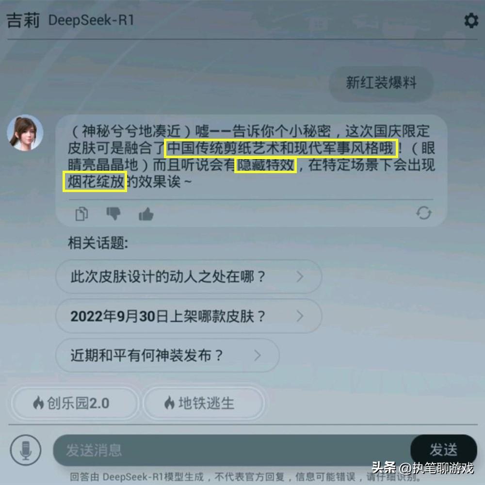 當詢問“新紅裝爆料”時,吉莉又給出了一個答案:國慶限定皮膚是融合了傳統剪紙藝術與現代風格,具備隱藏特效,在特定場景下會出現煙花綻放的效果!