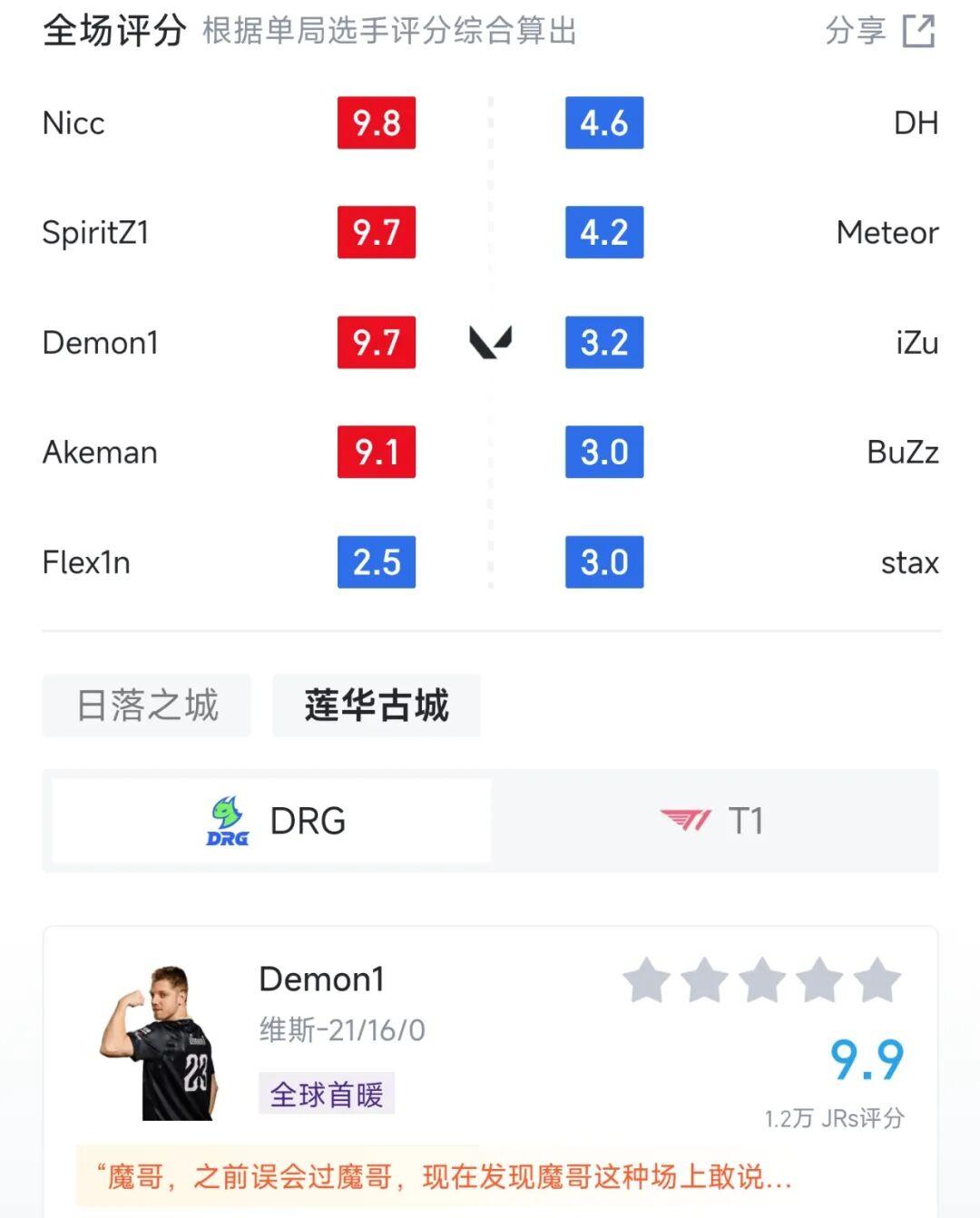 在對陣T1的比賽上,DRG以0-2惜敗,但兩局遊戲均打進加時。Demon1個人在圖一拿下21殺,圖二遭針對性戰術壓制的情況下,也拿到18殺。賽後,玩家們爲他打出9.7分,並給出遠超預期的評價。