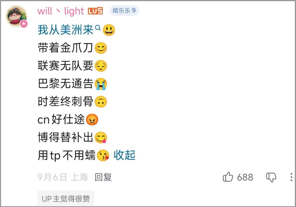 這次巴黎賽,中國玩家們又逮住了新的學習資料。有人制作了他努力說中文的集錦切片,視頻彈幕和評論區充滿了快活的空氣。語言的天塹,擋不住整活的共鳴——感覺這位大B老師,是爲了來上海點菜提前做準備是吧?