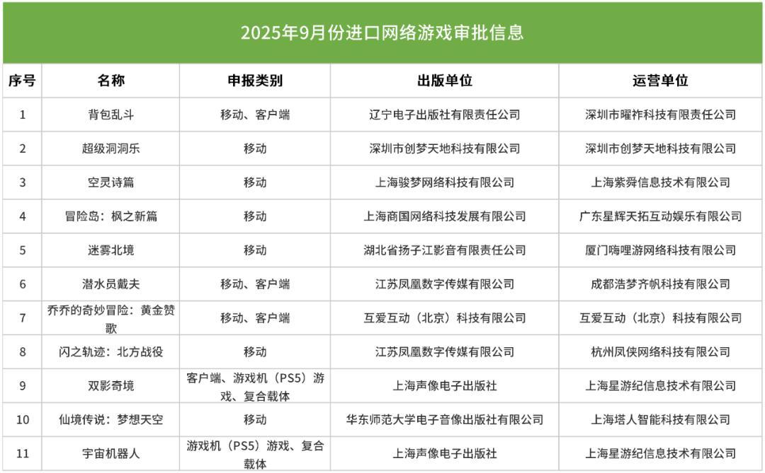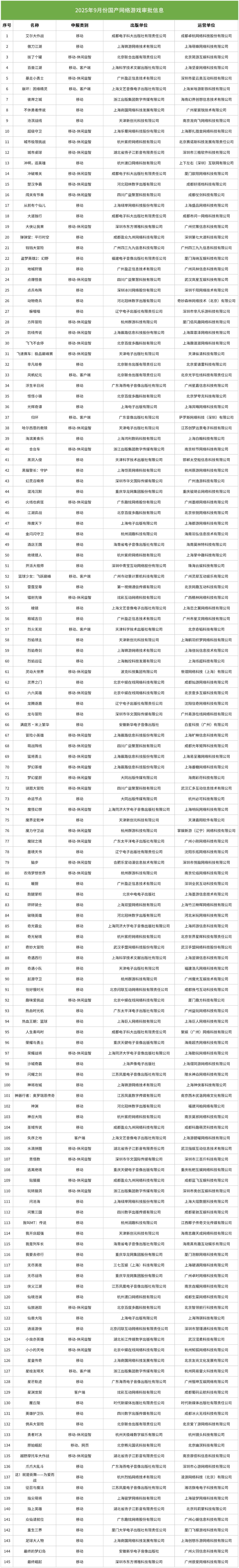 今天(9月24日),國家新聞出版署公佈了9月國產網絡遊戲審批信息(145款)、審批變更信息(9款),以及新一批進口遊戲審批信息(11款)。