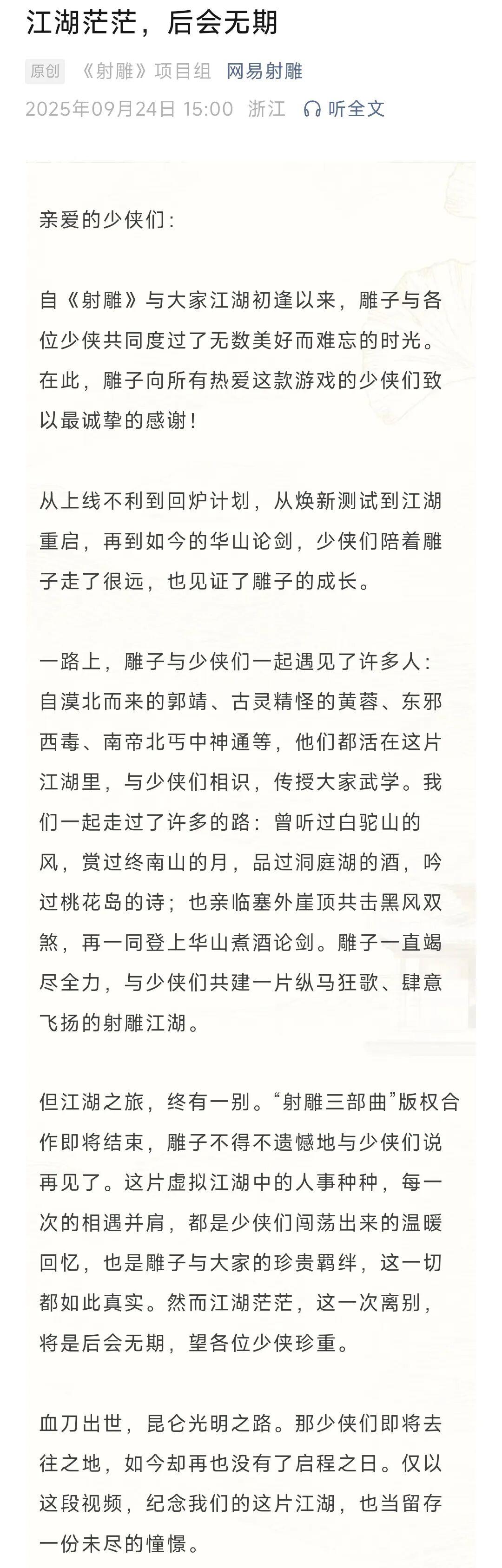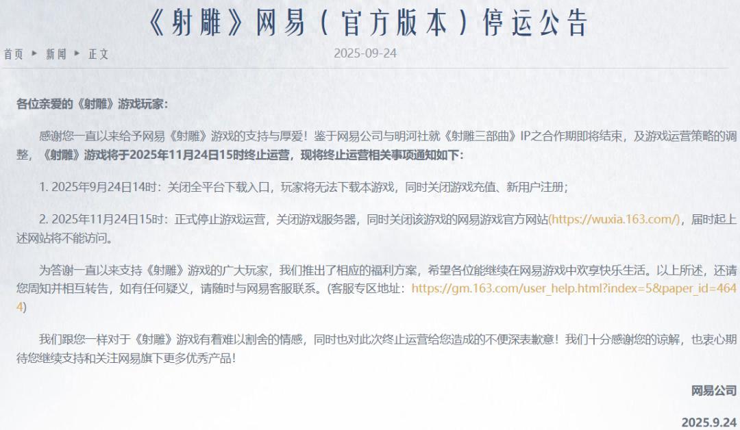 網易《射鵰》今日官宣即將停運:自救未果,迎來終局