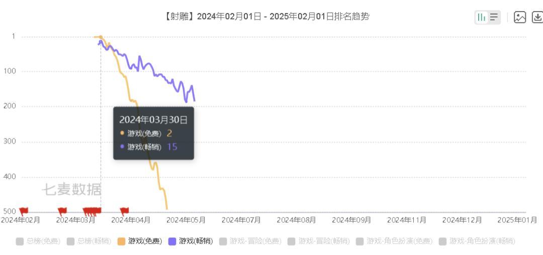 今年3月13日,2.0版本上線後,雖然有部分玩家很難接受這套數值邏輯和付費框架,但這個方向的改革的確行之有效,對一部分適應傳統MMO的玩家來說很對口味。加上項目組的持續優化,《射鵰》在雙榜上也終於找回了一些節奏,暢銷榜排名一度重回60~70名區間。