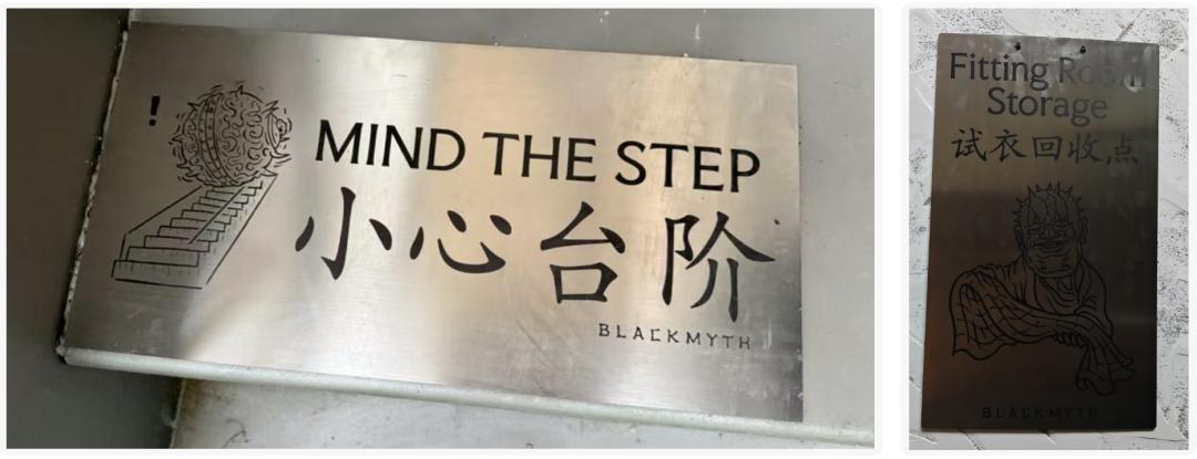 包括整個店面細節裏,也有相當多類似的設計思路:小心臺階-鐵球機關,試衣間-金池換新衣,禁止吸菸-土地公出去......如果你玩過遊戲,就會覺得這些元素的搭配實在是太貼切。