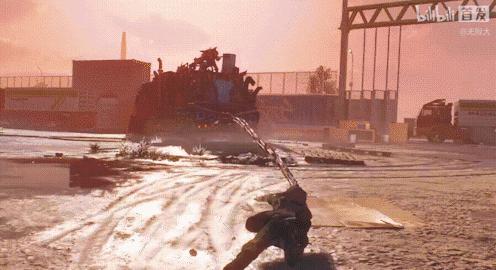 角色先是腳踩大卡車前的壓路滾筒,躲避它的碾壓,再拉來兩輛汽車把大卡車墊起;之後被車拖拽甩至屋頂時,主角乾脆又撿起一塊彩鋼瓦當做滑板,一路追逐卡車;