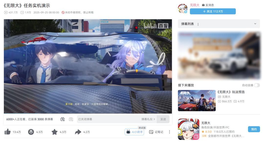 在TGS上,《無限大》提供了約30分鐘的試玩,內容分爲劇情模式和自由探索兩部分,但試玩者須先完成約十幾分鐘的劇情關卡——該流程視頻今早已由官方上傳B站,目前播放量已突破400萬。