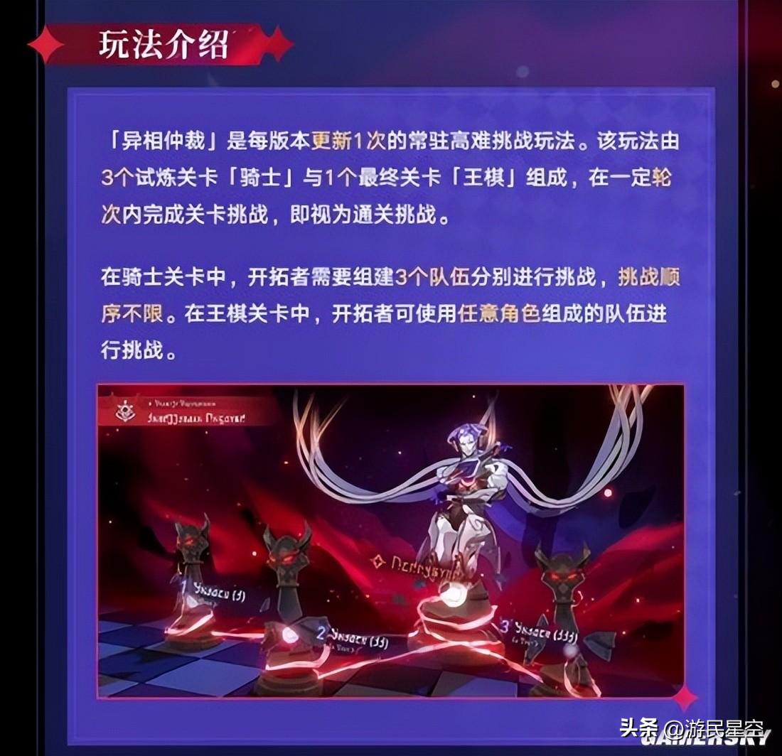 不難看出,“異相仲裁”就是一個“星鐵深淵試煉PULS升級版”。玩家將首先面臨三個“騎士”試煉關卡的考驗,有別於以往的挑戰玩法,“騎士”關卡需要玩家分別組建三個隊伍進行挑戰。而玩家若是完成了所有“騎士”關卡,玩家便可以解鎖削弱後的“王棋”最終關卡,當然,玩家也可以選擇直接打沒有被削弱過的“王棋”關卡來證明自己,但相對應的,其難度也會變得更具挑戰性。