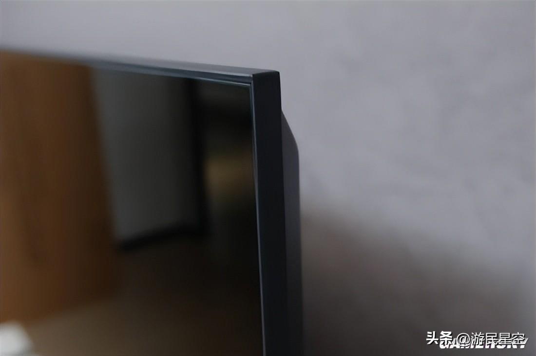整個屏幕的佔比相當大,邊框極窄,視覺觀感極佳。兩個一字型的支撐底座,配備了三顆隱藏螺絲和大面積的防滑墊,保持穩定性的同時,沒有破壞整個電視的美感。電視整體做工相當紮實,機身也不厚,沒有什麼臃腫的感覺,無論是底座模式還是直接掛牆,效果都相當不錯。