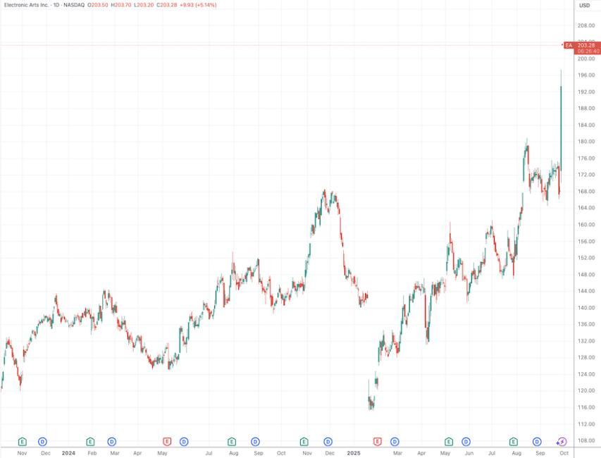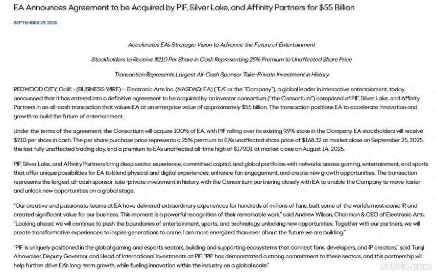 公告稱這是“史上規模最大的全現金私有化收購交易”,藝電股東將獲得每股210美元的現金對價。消息一出,藝電週一美股開盤後漲超5%,最新價格爲203美元,刷新上市以來的歷史新高。